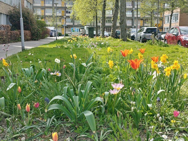 Wat een prachtig gezicht. Na de Bollen Blitz-actie, waarbij bewoners samen bollen hebben geplant in de wijk, staat 110 morgen nu volop in bloei. Tulpen, narcissen en nog veel meer kleuren sieren de buurt.
